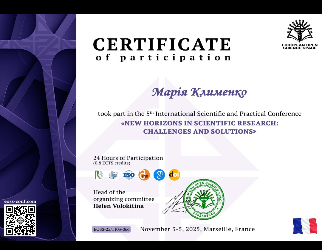 Участь у Міжнародній науково-практичній конференції "New Horizons in Scientific Research: Challenges and Solutions” (Марсель, Франція)