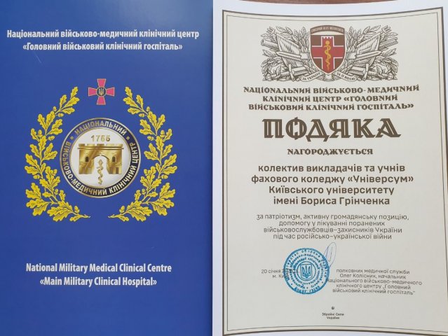 Подяка Коледжу від адміністрації Національного військово-медичного клінічного центру «Головний військовий клінічний госпіталь»