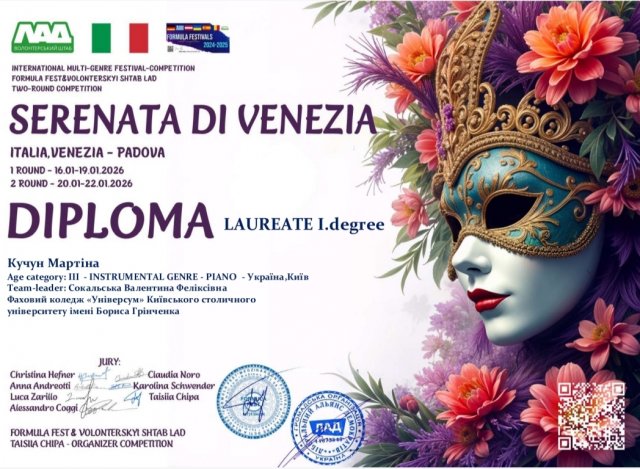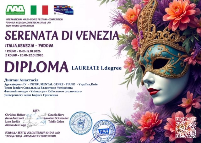 Вітаємо Диптан Анастасію та Кучун Мартіну з перемогою у Міжнародному конкурсі "Венеційська серенада"