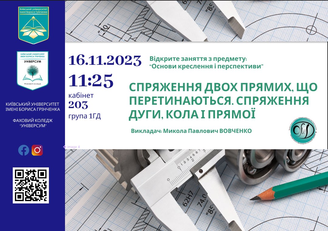 16 листопада 2023 року викладач циклової комісії образотворчого мистецтва і дизайну Фахового коледжу "Універсум" Київського університету імені Бориса Грінченка Вовченко Микола Павлович дав відкрите заняття з дисципліни "Основи креслення і перспективи” на тему “Спряження двох прямих, що перетинаються. Спряження дуги, кола і прямої” для студентів групи ГДфмб-1-23-4.0д.