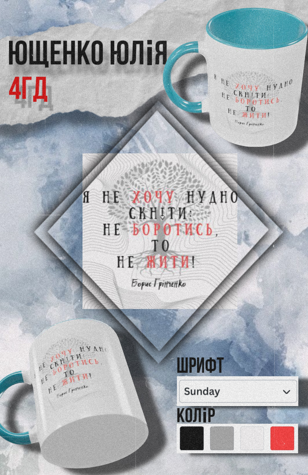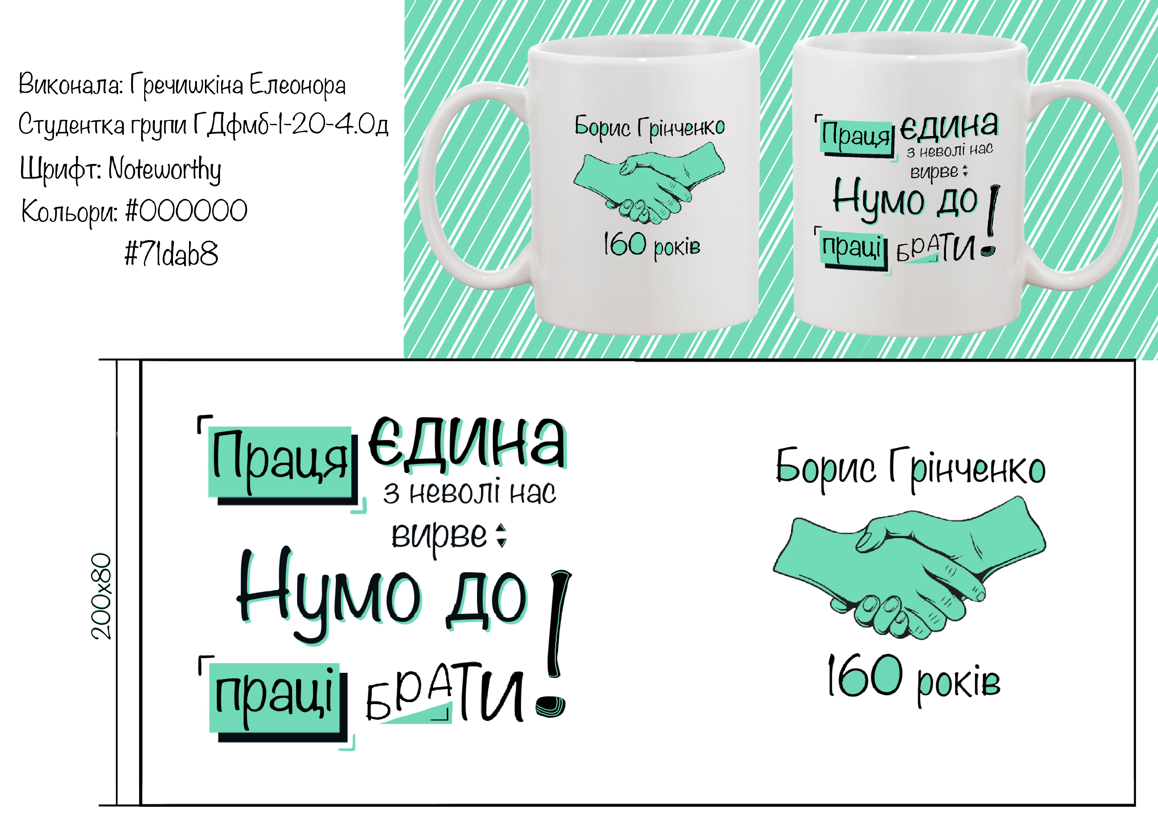 Основні види робіт, що провели студенти під час проходження практики (огляд літератури, збір та обробка фактичного матеріалу, підготовка наукової доповіді (статті) тощо) згідно з метою та завданнями даного виду практики підготовлено творчі композиції та макети для друку на чашках, статтю та презентацію для доповіді на конференції, виконано друк поліграфічної продукції безпосередньо в типографії, тематичні напрями досліджень: особливості підготовки макету для друку, друкарські процеси, види паперу, літературний добуток Бориса Грінченка та можливості його втілення в візуальній продукції.
