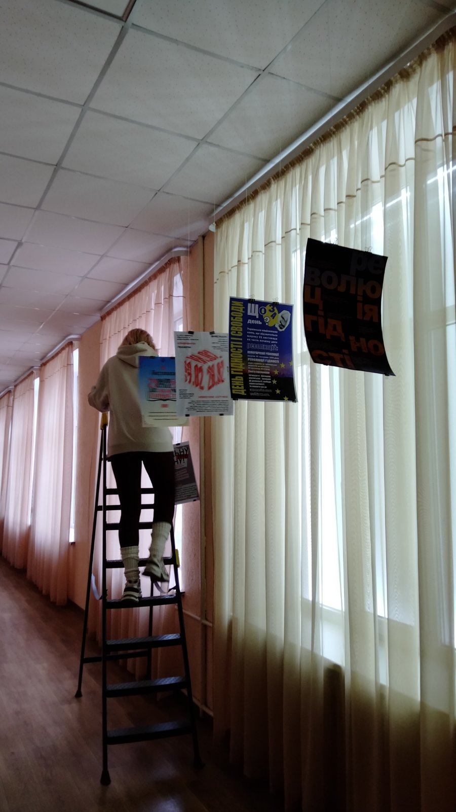Практично втілити отримані знання студенти змогли, виконуючи плакат до Дня Гідності і Свободи. Власні плакати вони презентували на виставці в приміщенні Фахового коледжу "Універсум".