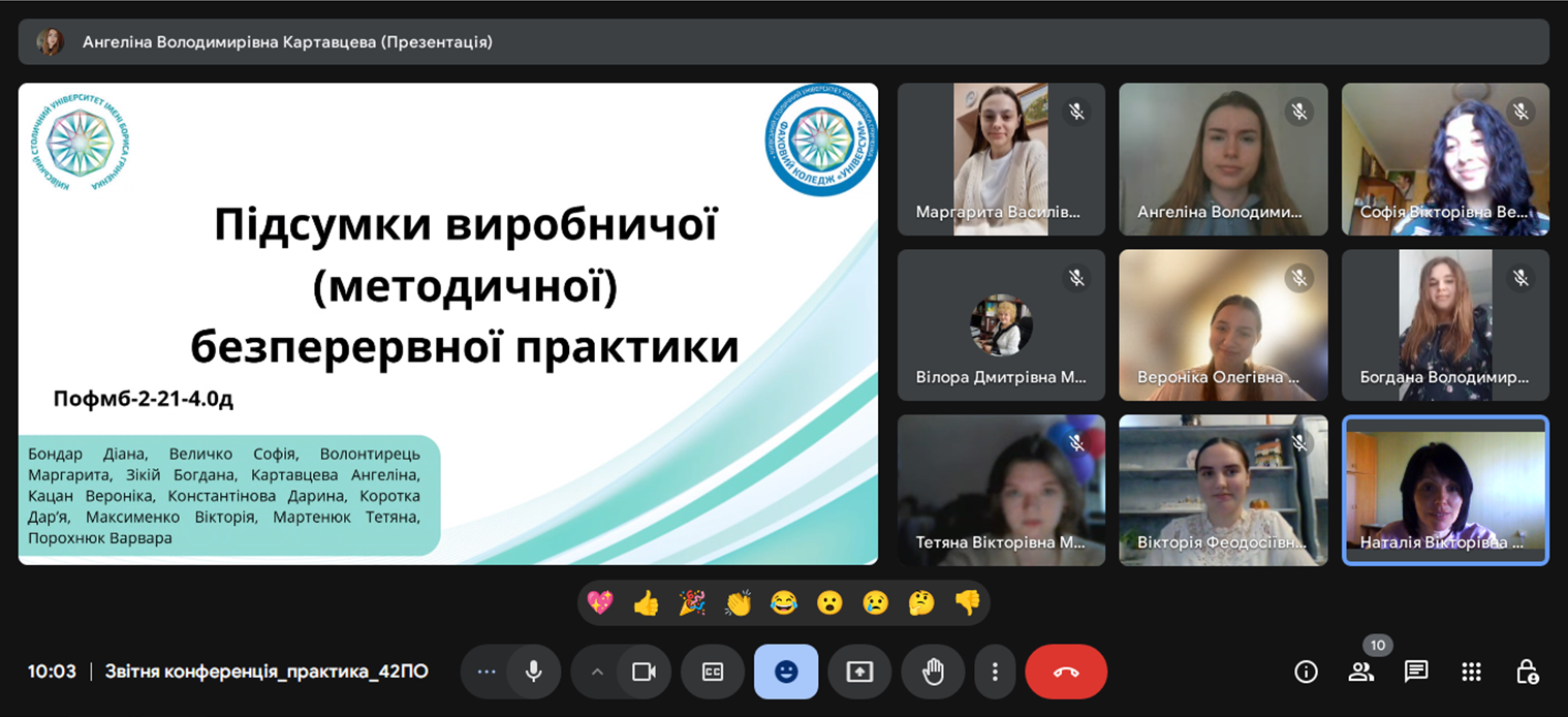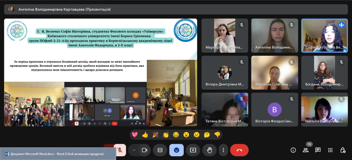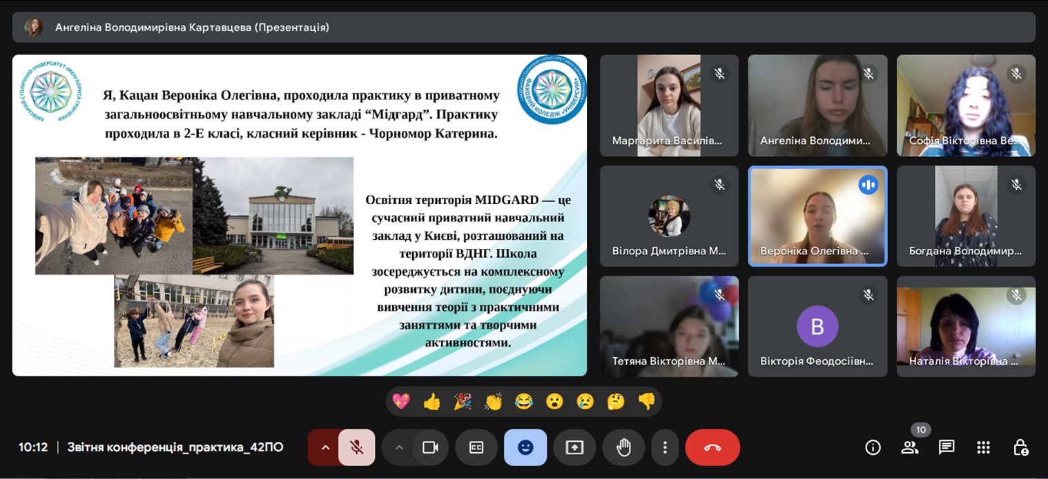 У період з 17 лютого по 24 березня 2025 року студенти 4 курсу спеціальності «Початкова освіта» груп ПОфмб-1-21-4.0д та ПОфмб-2-21-4.0д проходили виробничу (методичну) безперервну практику в закладах загальної середньої освіти. Під час практики студенти успішно закріпили та поглибили знання, здобуті в коледжі, а також удосконалили професійну підготовку як майбутні вчителі початкових класів. Вони мали можливість брати участь у навчальному процесі, розробляли та проводили уроки, активно використовуючи сучасні цифрові інструменти й платформи для інтерактивної взаємодії з учнями. Студенти продемонстрували вміння творчо підходити до викладання, застосовували інноваційні методи навчання, адаптували навчальний матеріал до індивідуальних потреб школярів, впроваджували диференційований підхід і методи проєктного навчання. Практика сприяла глибшому розумінню реалій сучасного освітнього процесу, розвитку педагогічних здібностей і формуванню актуальних фахових компетентностей, необхідних для ефективної роботи вчителя початкової школи. Вона стала важливим етапом професійного зростання, дозволивши студентам відчути себе впевнено у своїй майбутній професії.