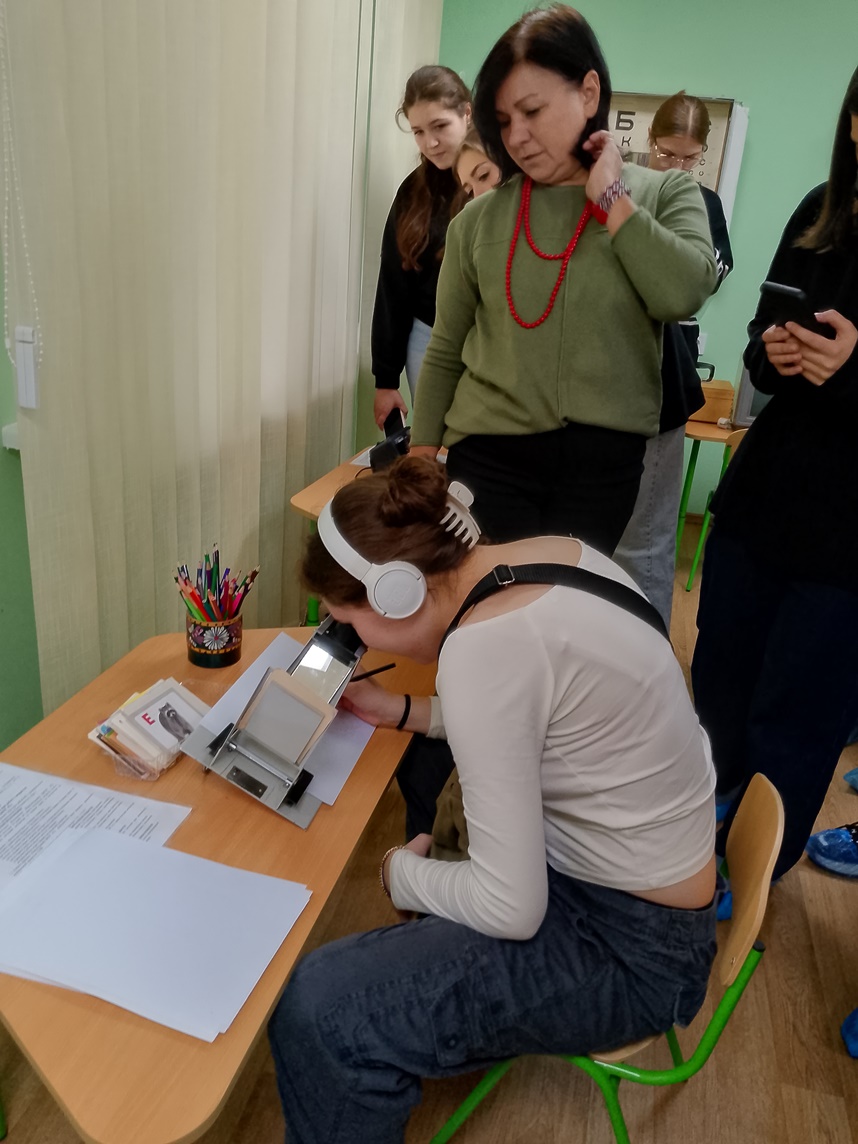 В закладі дошкільної освіти працюють 9 груп для слабозорих дітей та 1 різновікова група для сліпих дітей. В закладі організовано якісне дієтичне 4-х разове харчування (безкоштовне). Заклад дошкільної освіти працює за освітньою програмою для дітей від 2 до 7 років "Дитина" та “Програмою розвитку дітей сліпих та зі зниженим зором від народження до 6 років”. Для лікування та корекції зору в закладі функціонує ортоптичний кабінет оснащений офтальмологічним обладнанням та медичною апаратурою. Лікар-офтальмолог регулярно проводить огляд дітей, призначає лікування, визначає зорове навантаження для кожної дитини. Медсестра-ортоптистка виконує лікувальні процедури, згідно призначення лікаря, проводить оклюзію, слідкує за станом дітей. Студенти задавали питання стосовно організації виховного процесу в ЗДО. Щиро дякуємо за зустріч!