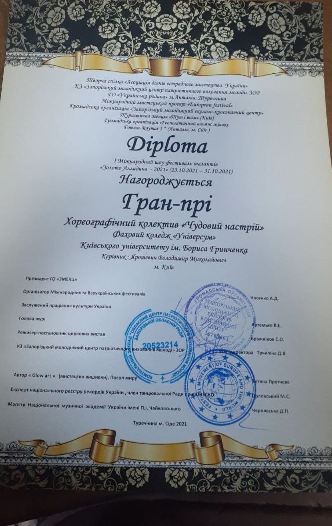 Вітаємо хореографічний колектив «Чудовий настрій» Фахового коледжу «Універсум» Київського університету імені Бориса Грінченка, який виборов Гран-прі Шоу-фестивалю талантів «Золото Аладдіна-2021», що проходив з 25 по 31 жовтня 2021 року у м.Сіде, Туреччина!
