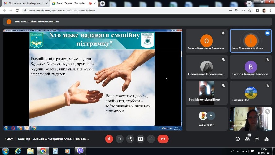 19 квітня 2022 року для студентів Фахового коледжу «Універсум» Київського університету імені Бориса Грінченка відбувся вебінар на тему: «Емоційна підтримка учасників освітнього процесу в умовах війни», на якому розглядалися питання: Як допомогти собі, та емоційно підтримати інших під час військового часу? Хто може надавати емоційну підтримку? Якими можуть бути реакції на стресові події? Кожен з учасників мав змогу поділитися своєю власною історією, або поставити уточнююче запитання.