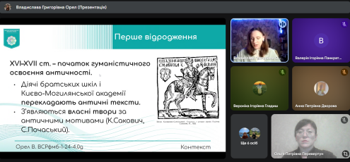 15 листопада 2025 року відбулася онлайн зустріч на тему “Інтерпретація античних сюжетів у сучасній культурі”. Учасники розглянули трансформацію образу Одіссея та інших гомерівських героїв у різних літературних напрямках ХХ-ХХІ ст. (на прикладах творів “Улісс” Джеймса Джойса, “Персі Джексон і Море чудовиськ” Ріка Ріордана, “Пенелопіада” Маргарет Етвуд, “Цирцея” Медлін Міллер). Наприкінці заняття було узагальнено досвід переосмислення античних сюжетів у світовій літературі.