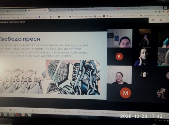 23 грудня 2020 року відбулася онлайн-бесіда «Свобода слова в журналістиці». Разом зі студентами проаналізували статистику свободи слова в Україні, географію порушень свободи слова в Україні, обговорили матеріали друкованих та інтернетних ЗМК щодо переслідування українських журналістів за висвітлені ними теми; проаналізували поняття «цензура» як елемент інформаційної війни, цензуру в медіапросторі.