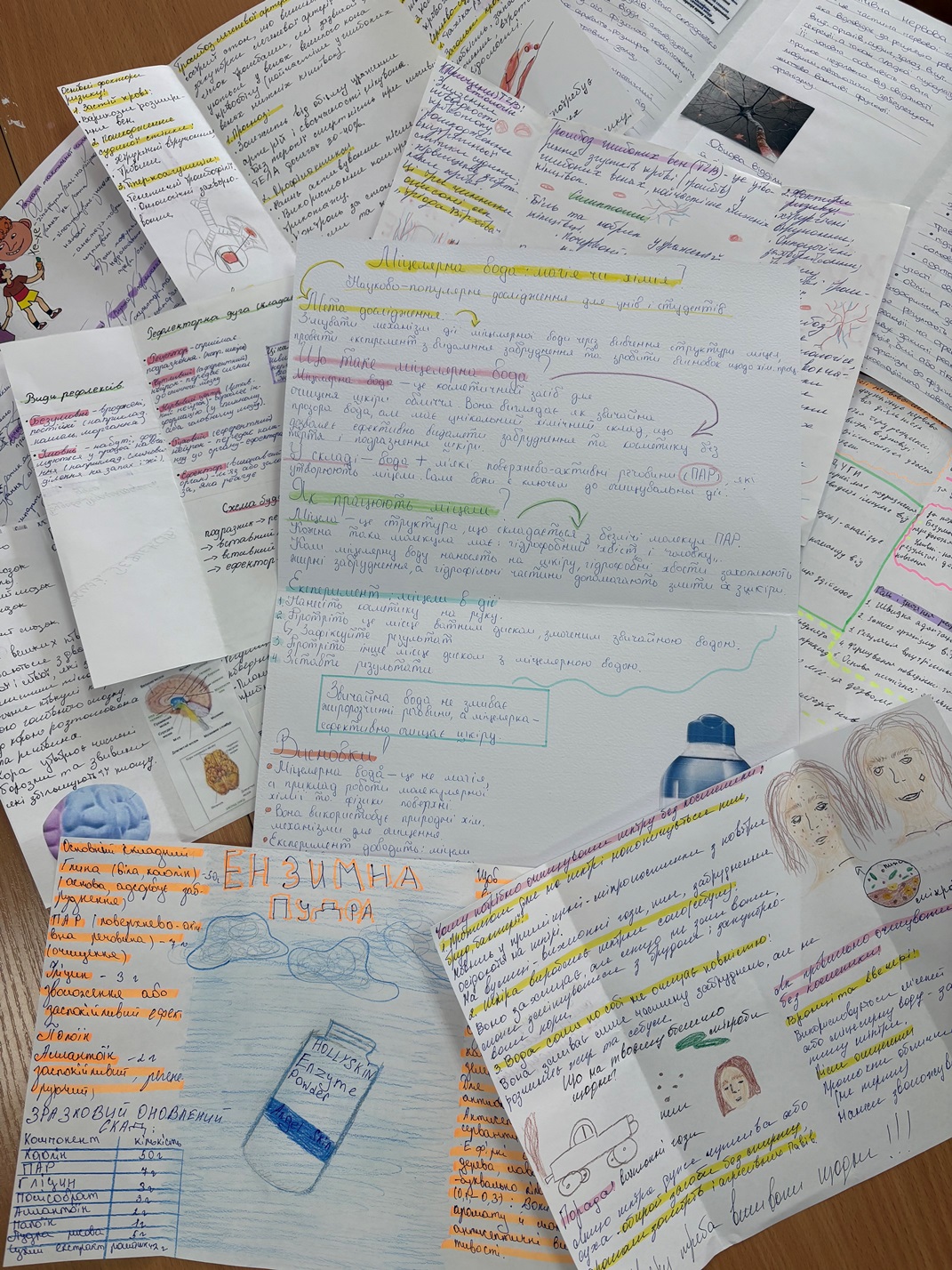 Учасники гуртка представили власний аналіз засобів для очищення шкіри - гелів, пінок, міцелярної води та скрабів. Студенти проаналізували вплив на власну шкіру зробленої на попередньому занятті пептидної пудри. У проєктах було обґрунтовано вибір інгредієнтів, представлено рецептури, технологію виготовлення. Учасники гуртка взяли інтервʼю у однолітків, висвітливши їх знання про особливості своєї шкіри та догляду за нею. Обговорили найбільш цікаві проєкти.