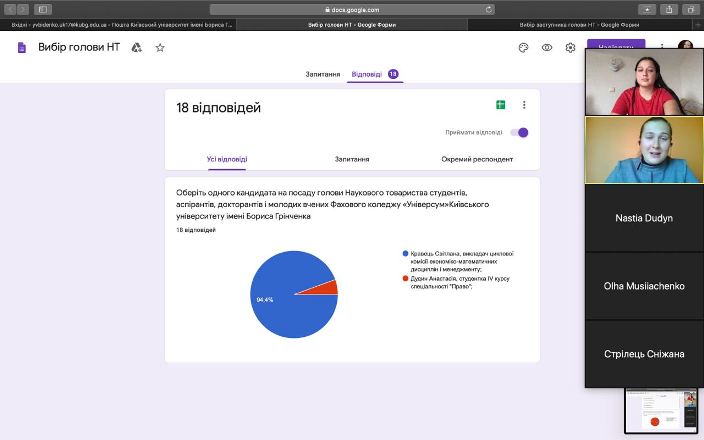 Під час конференції відбулися щорічні вибори голови Наукового товариства студентів, аспірантів, докторантів та молодих вчених Фахового коледжу "Універсум". Результатом голосування стало обрання голови Наукового товариства студентів, аспірантів, докторантів та молодих вчених Фахового коледжу "Універсум" – Кравець Світлани, викладача циклової комісії економіко-математичних дисциплін і менеджменту; заступника голови – Дудин Анастасії, студентки ІV курсу спеціальності «Право»; секретаря – Коляди Катерини, студентки ІІІ курсу спеціальності «Менеджмент».