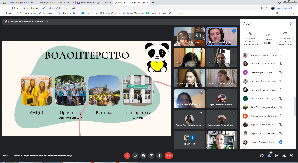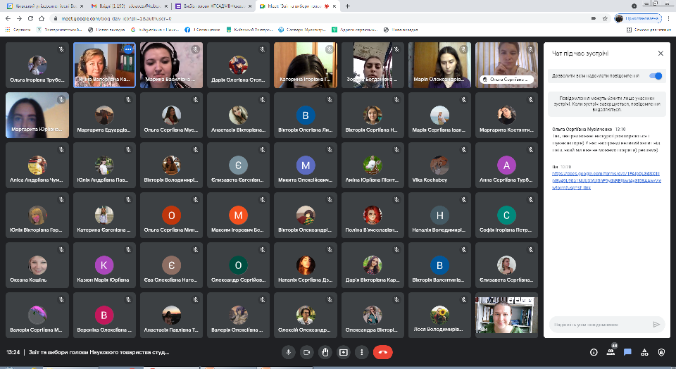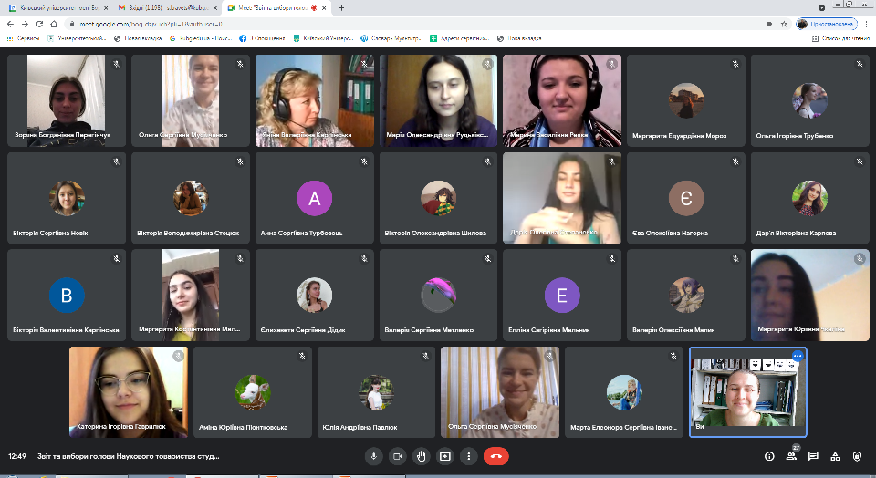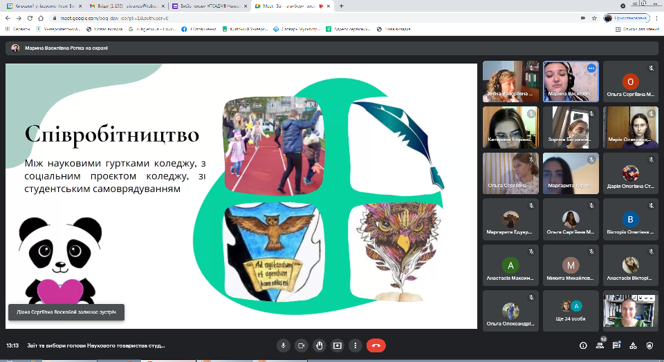 Після звіту відбулися онлайн вибори голови Наукового товариства Фахового коледжу «Універсам» Київського університету імені Бориса Грінченка. Кандидати, Кравець Світлана Геннадіївна, викладач циклової комісії економіко-математичних дисциплін і менеджменту та Рєпка Марина Василівна, викладач циклової комісії з педагогічної освіти, представили свої передвиборчі програми, деталізуючи основні напрями діяльності. За результатами виборів головою Наукового товариства було обрано Рєпку Марину Василівну, викладача циклової комісії з педагогічної освіти.