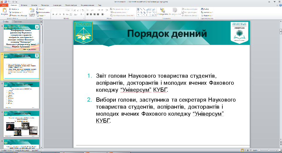За поданням голови Наукового товариства Фахового коледжу «Універсам» Київського університету імені Бориса Грінченка секретарем було обрано Коляду Катерину, студентку ІV курсу спеціальності «Менеджменту»
