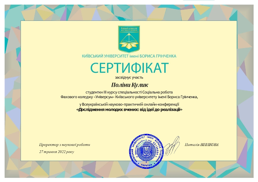 Поліна Кулик, Аміна Піонтковська, Ольга Трубенко, студентки III курсу спеціальності 231 Соціальна робота Фахового коледжу «Універсум» Київського університету імені Бориса Грінченка;