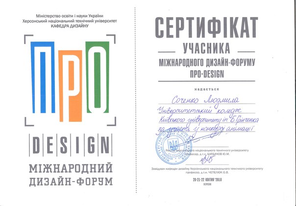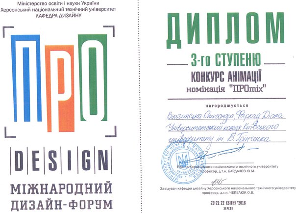 22 квітня 2016 року на базі Херсонського національного технічного університету відбувся Всеукраїнський конкурс анімації (Multiplex, ТРЦ FABRIKA). У конкурсі взяли участь студенти Університетського коледжу спеціальностей «Дизайн» та «Образотворче мистецтво» з анімаційними проектами «Тріумф невідомого» (Козловской Олексій, Черненко Анастасія, Калініченко Юрій, 4 курс, спеціальність «Дизайн»), «Суперстудент» (Соченко Людмила, Корякіна Єлизавета, Давиденко Дарина, 2 курс, спеціальність «Образотворче мистецтво»), «Один день з життя студента» (Фархад Діана, Вільчинська Олександра, випускники 2015 року, спеціальність «Дизайн»), «Історія одного художника» (Фархад Діана, Вільчинська Олександра, випускники 2015 року, спеціальність «Дизайн»), «Муки творчості» (Савич Дарина, 4 курс, спеціальність «Дизайн»). Модераторами проектів стали: Ладоненко М.І., Казіміренко О.В.