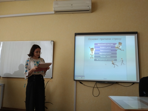 17 квітня 2019 року в Університетському коледжі відбувся тренінг «Стрес-менеджмент». Під час першої частини заняття студентам розповідали що таке стрес, його вплив на життя та поведінку людини; охарактеризували різні види стресу, стадії та причини виникнення.
