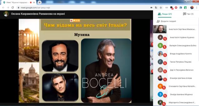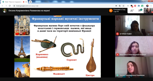 29 квітня 2020 року о 15.00 у дистанційному форматі засобами додатку Google Hangouts було проведено інтерактивне заняття «Музичні подорожі країнами Європи».
