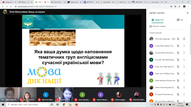 23 листопада 2020 року було проведено науково-практичний семінар на тему: "Вплив англійської мови на українську та інші мови світу на сучасному етапі". Студенти проаналізували роль англіцизмів у сучасній українській молодіжній мові та окреслили позитивні та негативні риси даного впливу, а також вказали основні причини такого явища.