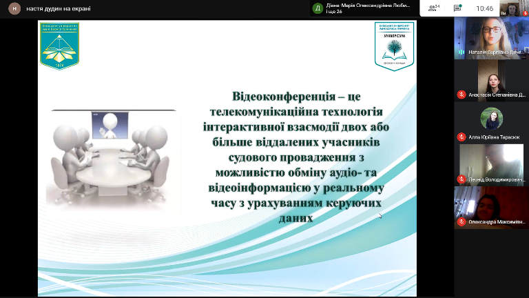 19 грудня 2020 року в рамках декади педагогічної майстерності викладачів циклової комісії суспільних дисциплін і правознавства Фахового коледжу "Універсум" відбулася студентська наукова конференція “Актуальні питання оновлення законодавства в умовах пандемії: теорія та практика”, участь в якій взяли студенти групи ПРмс-1-17-4.0д. Модераторка заходу - Алла Юріївна Тарасюк.