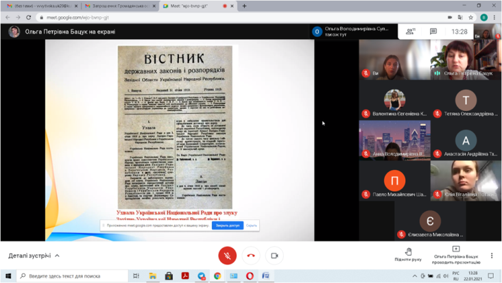 22 січня 2021 року до Дня Соборності України в Фаховому коледжі «Універсум» викладачі циклової комісії суспільних дисциплін та правознавства Березовська М.Г., Бацук О.П., Грищенко Л.В., Рябоконь Ю.С., Москаленко О.А. провели інформаційні бесіди для студентів спеціальностей Початкова освіта, Право, Хореографія, Фінанси і кредит.