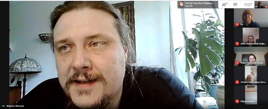 Студенти з великим зацікавленням слухали розповідь про маловідомі факти з життя видатних музичних діячів, які вийшли з родини Лисенків - нащадків фундатора української класичної музики Миколи Віталійовича Лисенка. Зокрема гість зупинився на творчій біографії свого батька, Віталія Романовича Лисенка, хорового диригента, заслуженого діяча мистецтв УРСР, професора Київської консерваторії, народного артиста України.