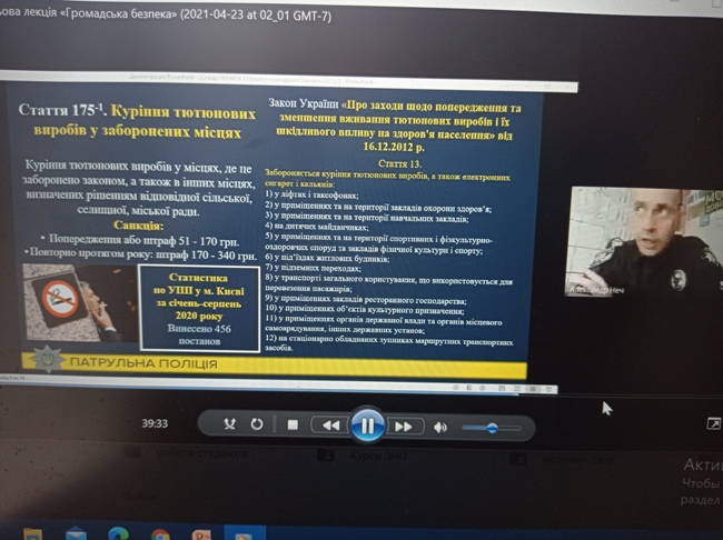 23 квітня 2021 року в Фаховому коледжі "Універсум" рамках Дня коледжу відбулась онлайн-зустріч інспектора відділу зв'язків з громадськістю управління патрульної поліції у м. Києві, Департаменту патрульної поліції майора поліції Нечаюка О.П., зі студентами 1, 2 курсів спеціальності "Право" та "Початкова освіта". Зустріч проходила в форматі гостьової лекції в рамках роботи клубу «Людина професії» та у співпраці з членами Ради роботодавців.