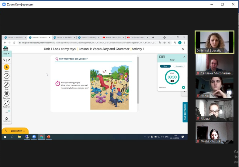 22 листопада 2021 року відбулася зустріч студентів групи ПОмс-1-18-4.0д Фахового коледжу «Універсум» Київського університету імені Бориса Грінченка з Людмилою Сидорчук, методистом Dinternal Education, досвідченим викладачем англійської мови (кваліфікація CELTA), співавтором серії книг Fly High Ukraine, сертифікованим екзаменатором міжнародних іспитів Pearson English International Certificate та Pearson English International Certificate Young Learners. Зустріч проходила у форматі гостьової інтерактивної лекції на тему «EffectivelessonplanningforGenerationAlphakidswithTeamTogether». Людмила Сидорчук розповіла про особливості роботи з дітьми молодшого шкільного віку та поділилася ефективними прийомами навчання учнів англійської мови.