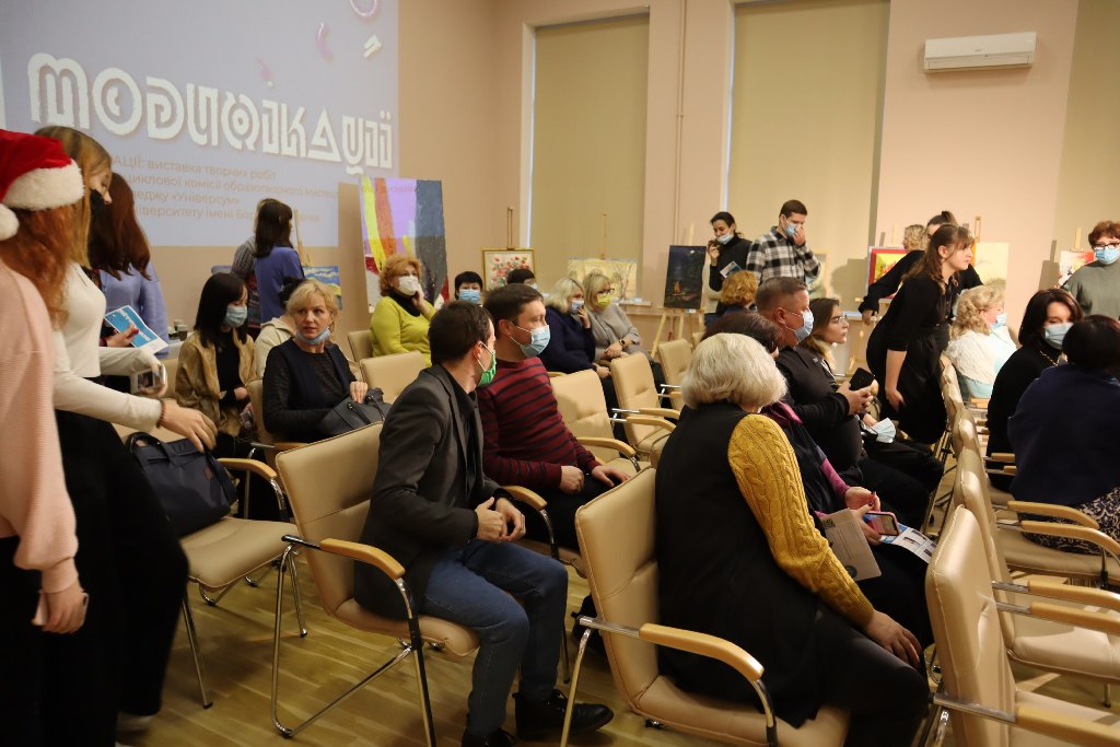 07 грудня 2021 року в актовій залі відбулося урочисте відкриття виставки «Модифікації». Свої творчі роботи представили викладачі циклової комісії образотворчого мистецтва і дизайну Фахового коледжу «Універсум» Київського університету імені Бориса Грінченка, зокрема: Ольга Овчаренко, Олена Казіміренко, Юлія Шеменьова, Ольга Дєточка, Наталія Щербак, Ярослав Білик, Катерина Попович та Микола Вовченко.