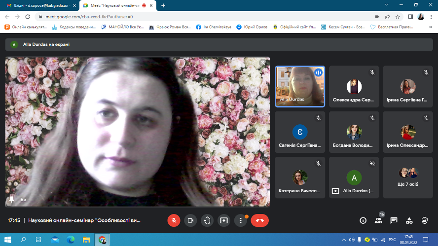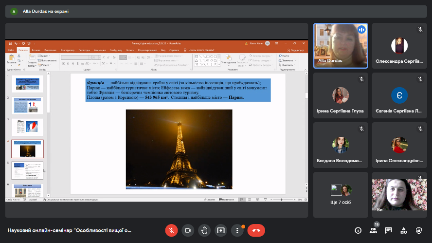 08.04.2022 р. в рамках декади циклової комісії з педагогічної освіти було проведено науковий онлайн-семінар “Особливості вищої освіти у Франції” для студентів IV курсу спеціальності "Початкова освіта". Спікеркою заходу стала Алла Петрівна Дурдас, доктор філософії, старший викладач кафедри сучасних європейських мов Державного торгівельно-економічного унверситету. На семінарі студенти дізналися, що управління вищою освітою у Франції здійснюється міністром національної освіти через посередницьку діяльність національної ради вищої освіти та наукових досліджень, а основною адміністративною одиницею є навчально-дослідницьке об'єднання, автономне в межах університету й створено для вирішення основного завдання - адміністративно та практично пов'язати навчальний процес й наукові дослідження. Завершився захід дискусією між студентами та спікером. Щиро дякуємо Аллі Петрівні Дурдас за змістовний онлайн-семінар!