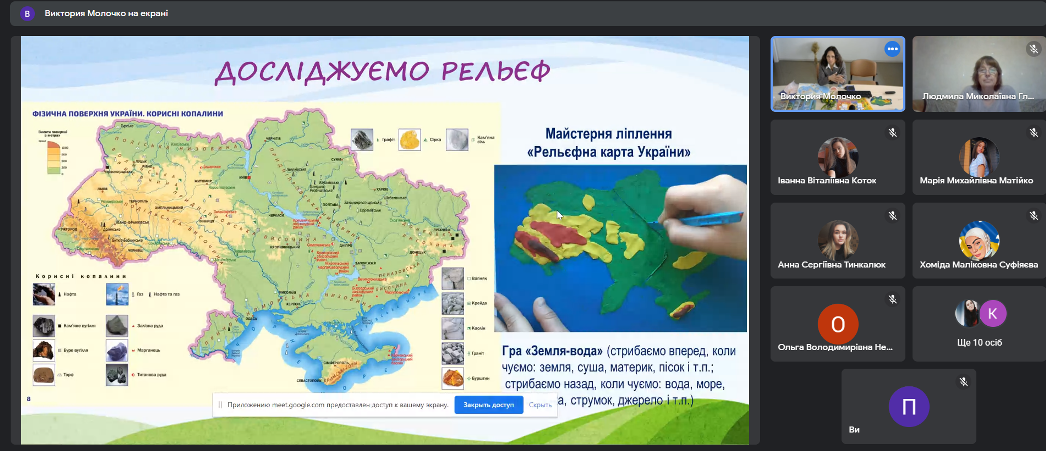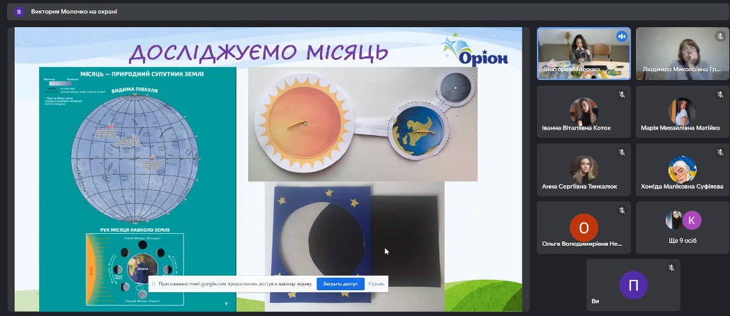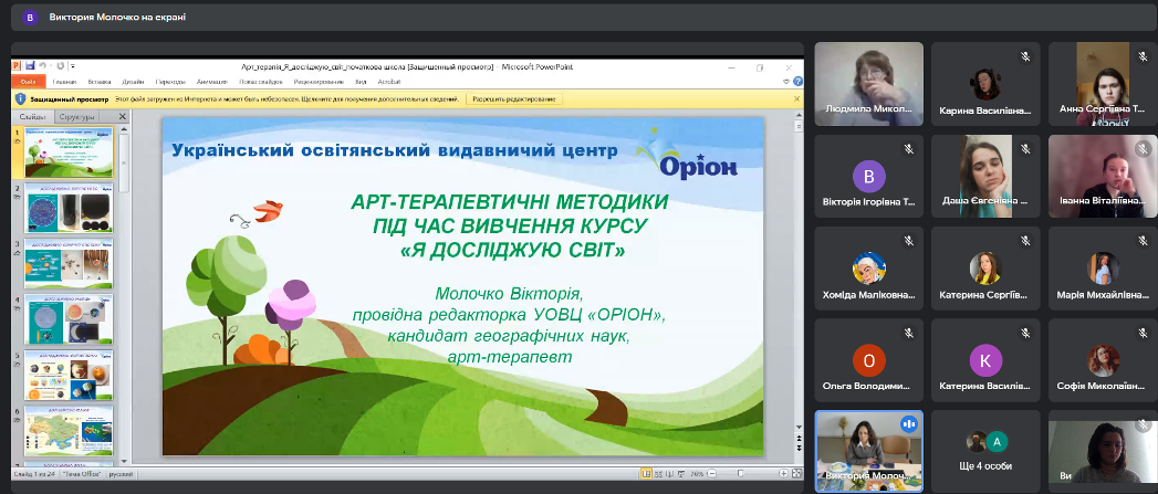 27 квітня 2022 року у Фаховому коледжі «Універсум» Київського університету імені Бориса Грінченка для студентів групи ПОмс-3-19-4.0д в рамках декади ЦК природничих дисциплін відбулася зустріч з провідним редактором Українського освітянського видавничого центру «ОРІОН», кандидатом географічних наук, арт-терапевтом Молочко Вікторією Валеріївною. Тема зустрічі: «Навчаємося граючи на уроках інтегрованого курсу «Я досліджую світ»».