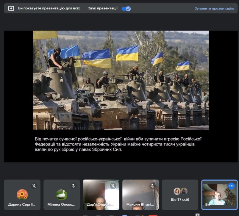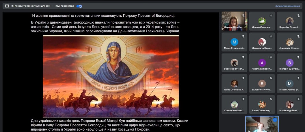 14 жовтня 2022 року Олена КАЗІМІРЕНКО, викладач Циклової комісії образотворчого мистецтва і дизайну Фахового коледжу “Універсум” під час кураторської години, разом з групою І курсу спеціальності “Дизайн” згадали основні віхи історії України, які передували святу, відзначили мужність та завзятість військових, які сьогодні відстоюють наше право на існування, закцентували увагу на захисницях, які поряд з чоловіками відстоюють нашу свободу та вшанували пам’ять загиблих воїнів.
