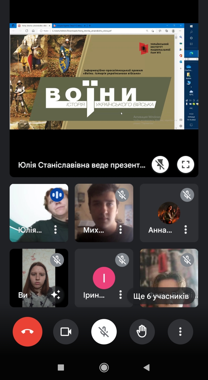 14 жовтня 2022 року в Фаховому коледжі "Універсум" Київського університету імені Бориса Грінченка до Дня Захисників і Захисниць України в групі 2 курсу спеціальності "Музичне мистецтво" було проведено відеолекторій на тему "Хроніки історії українського війська. Воїни".