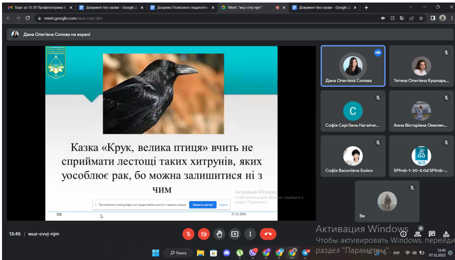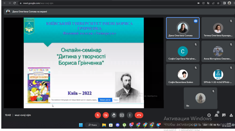 07.12.2022 р. з нагоди 159-ї річниці від дня народження Бориса Дмитровича Грінченка було проведено онлайн-семінар "Дитина у творчості Бориса Грінченка" для студентів ІІІ курсу спеціальності "Соціальна робота". Мета заходу - висвітлити зміст творів Бориса Дмитровича для дітей. Борис Дмитрович Грінченко у своїх казках особливо підносить почуття людської гідності героїв, зумовлене чесною працею, шанобливо ставиться до народної мудрості. У казках Бориса Дмитровича Грінченка закладений повчальний зміст. Хвалькуватість, підлесливість, боягузтво, зазнайство автор висвітлює як найбридкіші риси в людині, адже казка повинна навчити чесності, порядності в житті. Розмаїття Грінченкових легенд та казок дає змогу малому читачеві поринути у чарівний світ, де сваряться і миряться звірі, де правда перемагає над кривдою, де зло не лишається непокараним, а добро – винагородженим.