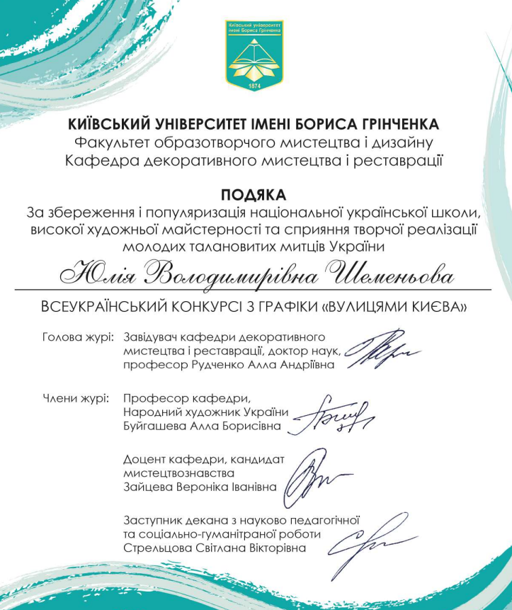 Вітаємо Волянську Варвару, Власюк Маргариту та Шпак Марію, студенток 3 та 4 курсу спеціальності Образотворче мистецтво за друге місце у Всеукраїнському конкурсі з графіки "Вулицями Києва" (організатор кафедра декоративного мистецтва і реставрації факультету образотворчого мистецтва і дизайну Київського університету імені Бориса Грінченка). Бажаємо творчих успіхів у нових мистецьких проєктах!