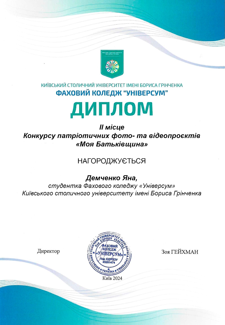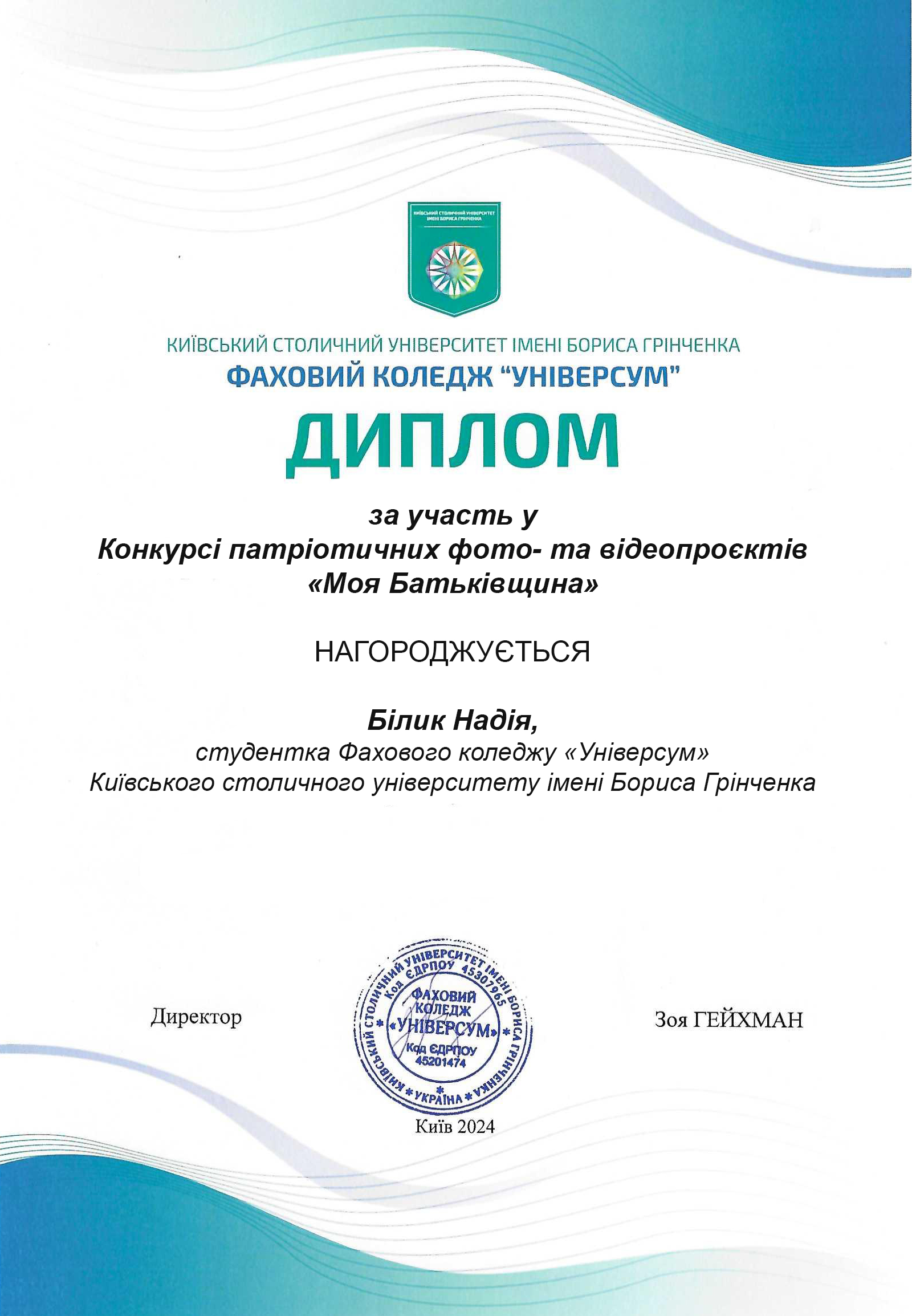 З 06 по 22 травня 2024 року в Фаховому коледжі «Універсум» Київського столичного університету імені Бориса Грінченка відбувся Конкурс патріотичних фото- та відеопроєктів "Моя Батьківщина". До участі були запрошені студенти Фахових коледжів, професійно-технічних училищ та учні загальноосвітніх навчальних закладів.