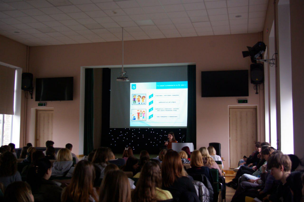 Практичний психолог коледжу Інна Миколаївна Вітер у першій частині зустрічі розповіла студентам і викладачам про природу виникнення булінгу, його основні форми — фізичну, психологічну, вербальну та кібербулінг, а також про наслідки для жертв, свідків і самих агресорів. Під час інтерактивного обговорення учасники заходу визначали, як розпізнати прояви цькування, і які кроки слід робити, щоб цьому запобігти.
