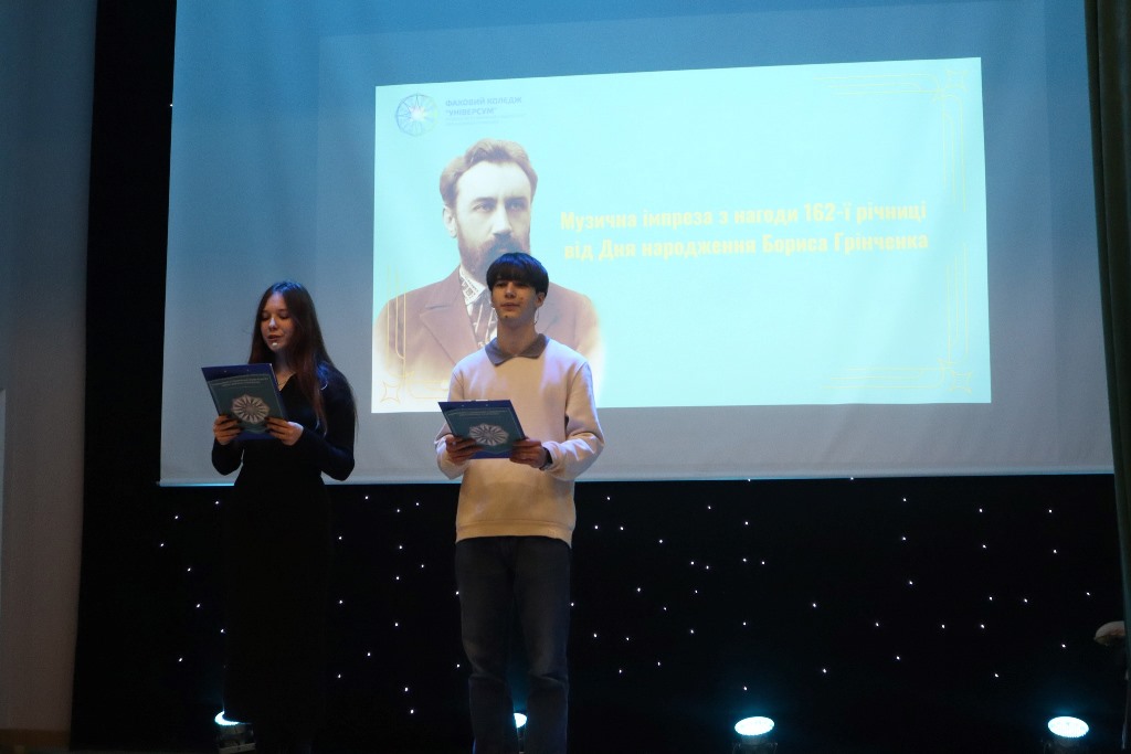 09 грудня 2025 року, з нагоди 162-ї річниці від Дня народження Бориса Грінченка, у Фаховому коледжі «Універсум» було проведено мистецьку подію — Музичну імпрезу «Україна! У цьому слові для мене все…», яка стала не лише даниною пам’яті Б. Грінченка, але й нагадуванням про його глибоку любов до України, рідної мови та національної культури. Саме ці цінності були покладені в основу тематичної програми, яку підготували студенти і викладачі циклової комісії музики і хореографії.
