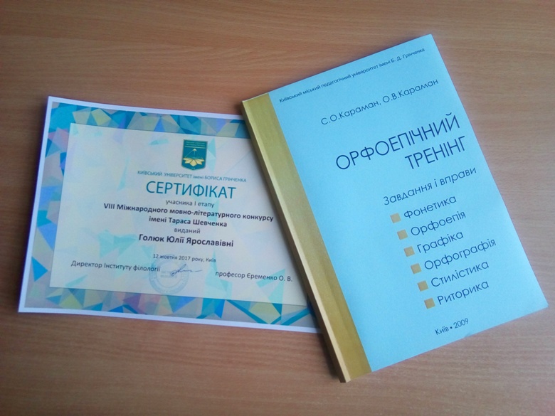 У День української писемності та мови в Київському університеті імені Бориса Грінченка відбулося нагородження студентів Університетського коледжу спеціальності Видавнича справа та редагування, що брали участь у І етапі VІІІ Міжнародного мовно-літературного конкурсу імені Тараса Шевченка: Кучережко Дарини (грамота за ІІІ місце), Голюк Юлія та Троїцька Дар’я (сертифікати).