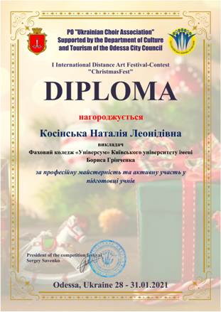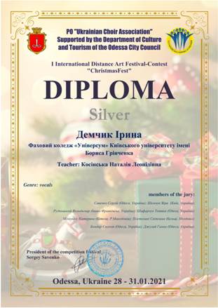 28.01-31.01.2021р. відбувся І Міжнародний фестиваль-конкурс мистецтв "СhristmasFest" (дистанційно), який проводила Українська Хорова Асоціація.