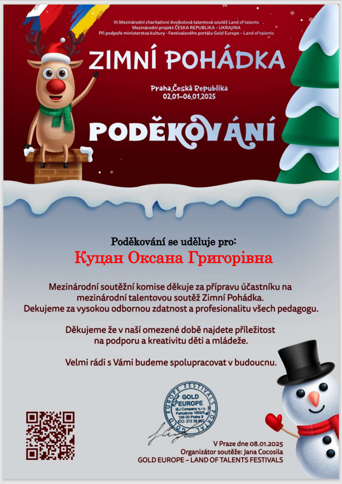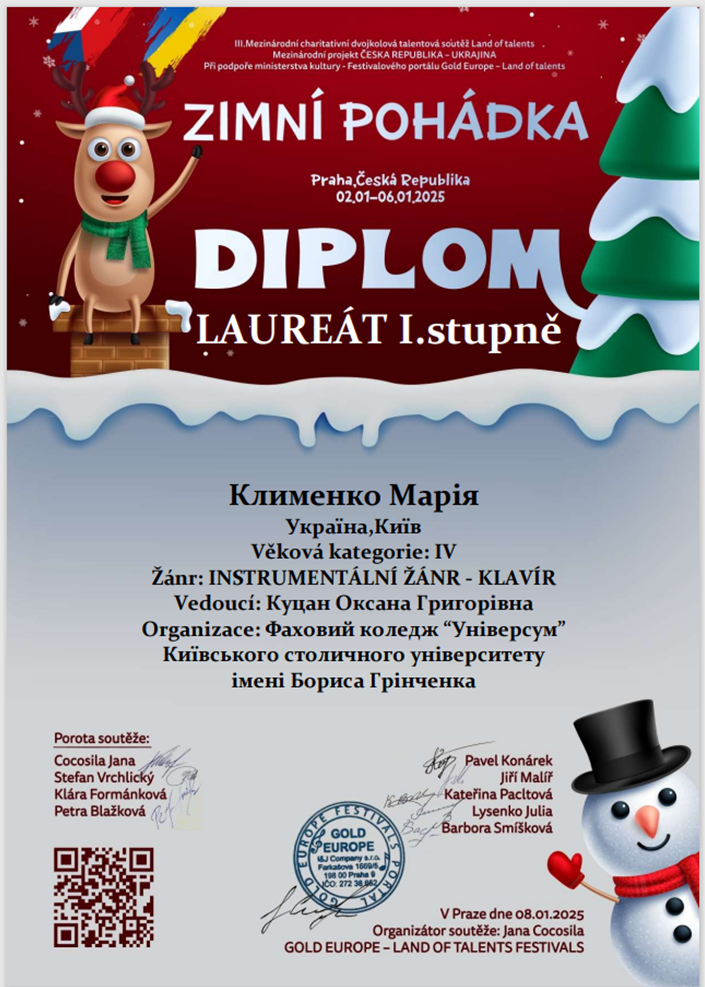 2-6 січня 2025 року у м. Прага (Чехія) відбувся Міжнародний благодійний двотуровий конкурс мистецтв "Зимова казка". Студентка 1 курсу спеціальності «Музичне мистецтво» Клименко Марія здобула перемогу у конкурсі і отримала диплом І ступеня.