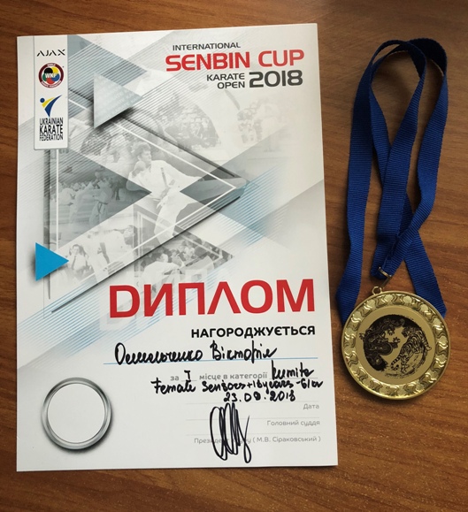 Вітаємо студентку ІV курсу спеціальності «Фізичне виховання» Університетського коледжу Омельченко Вікторію із здобуттям двох золотих медалей у категорії Female Kumite Seniors - 61кг і у категорії Female Team Kumite та бронзової медалі у категорії Female Kata Seniors на Міжнародному кубку International Sen-Bin Cup 2018, який відбувся 22-23 вересня 2018 року у місті Києві.