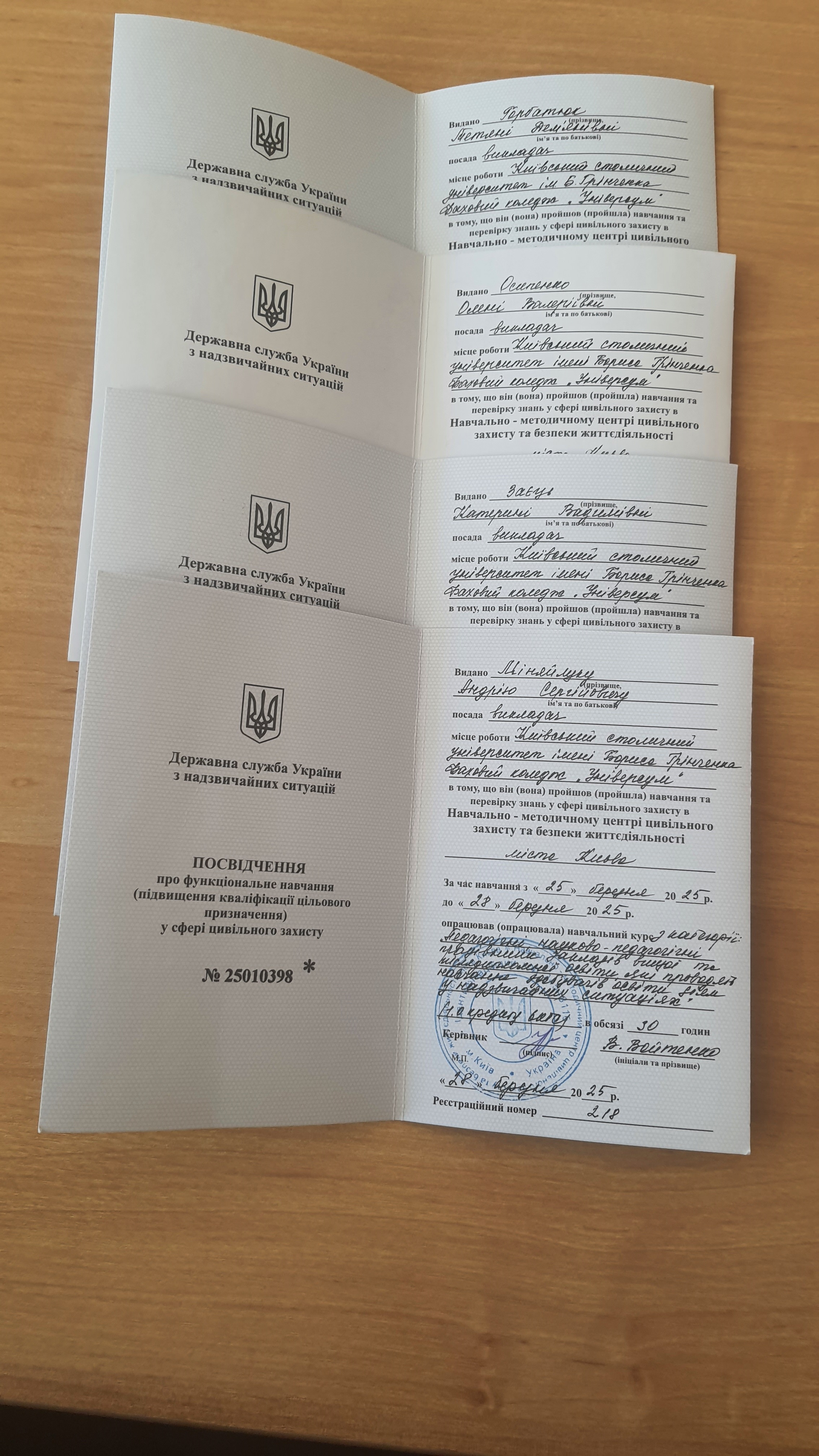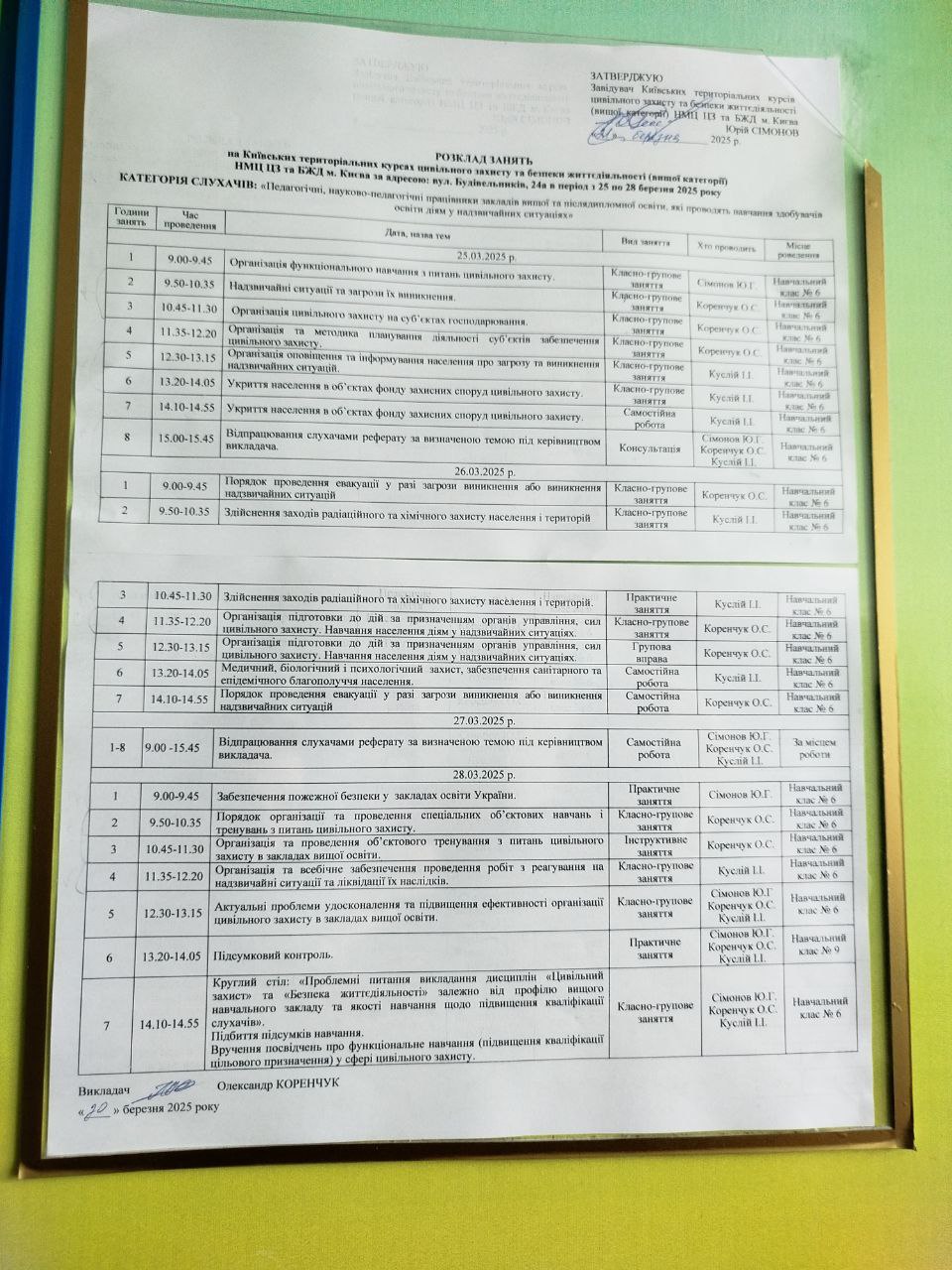 З 25.03.2025 по 28.03.2025 в рамках підвищення кваліфікації педагогічних працівників викладачі циклової комісії фізичного виховання Катерина Заєць, Олена Осипенко, Андрій Міняйлук та Тетяна Горбатюк прослухали курс «Педагогічні, науково-педагогічні працівники закладів вищої та післядипломної освіти, які проводять навчання здобувачів освіти діям у надзвичайних ситуаціях» на базі ДСНС Дніпровського району міста Києва.