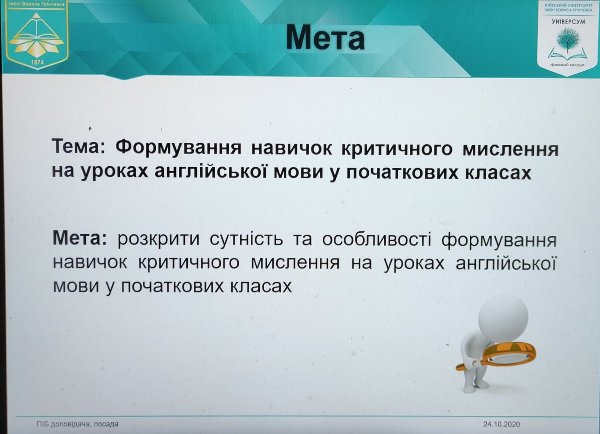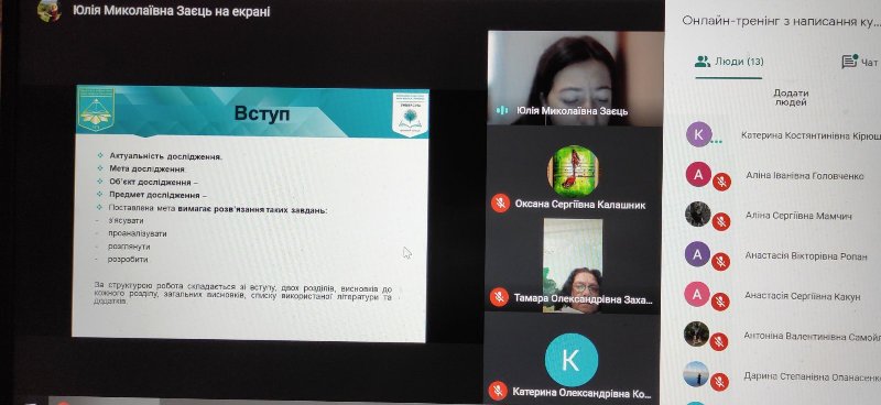 24.10. 2020 у Фаховому коледжі "Універсум" відбувся онлайн-тренінг з написання курсової роботи з методики навчання іноземної мови для студентів випускних груп спеціальностей "Початкова освіта" та "Дошкільна освіта". Під час тренінгу студенти ознайомилися зі структурою та етапами написання курсової роботи. Студенти вправлялися у формулюванні мети, об'єкту, предмету та завдань дослідження відповідно до обраних тем.