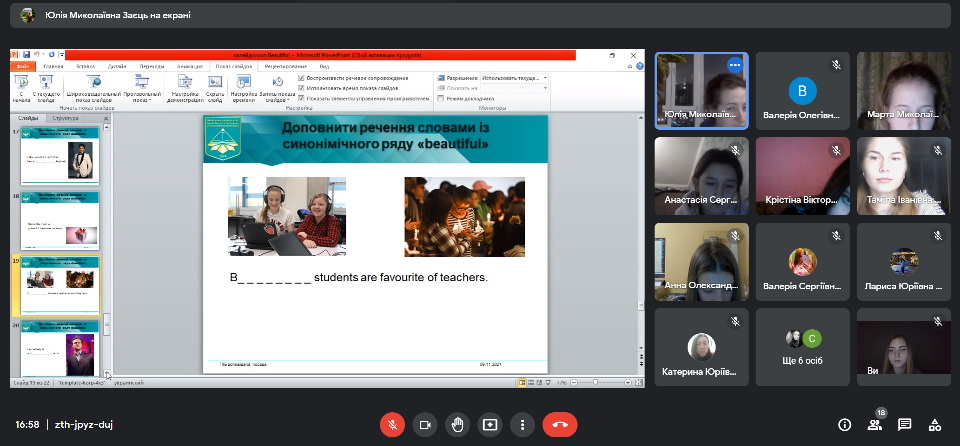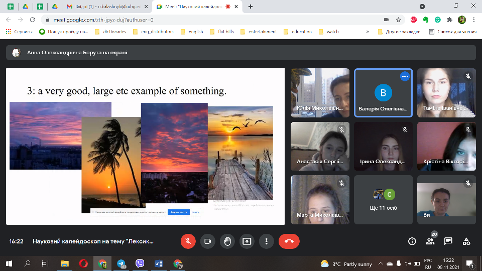 09 листопада 2021 року у рамках декади циклової комісії іноземних мов було проведено науковий калейдоскоп на тему: «Лексико-семантичні особливості вживання описових прикметників (на основі синонімічного ряду слова «beautiful»). Студенти проаналізували лексико-семантичні особливості концепту beauty та його структурні елементи на матеріалі англомовних лексикографічних джерел.