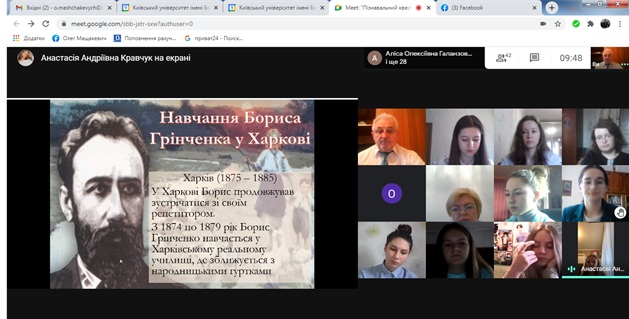 09.12.2020 року з нагоди 157 річниці з дня народження відомого українського письменника, педагога, лексикографа, літературознавця, етнографа, історика, публіциста та громадсько-культурного діяча Бориса Дмитровича Грінченка студенти 3-го курсу Фахового коледжу "Універсум" спеціальності Менеджмент провели зі студентами 1-го курсу пізнавальний квест «Життєвий шлях Бориса Грінченка».