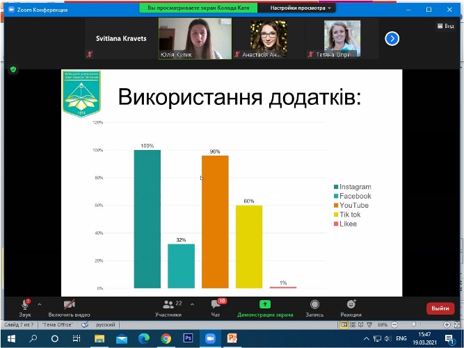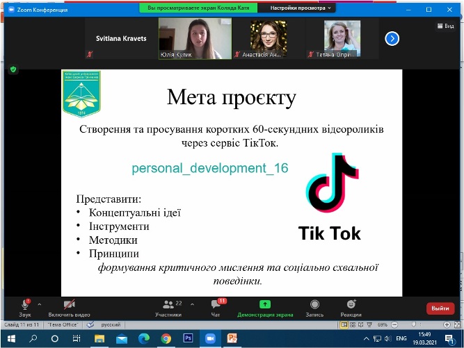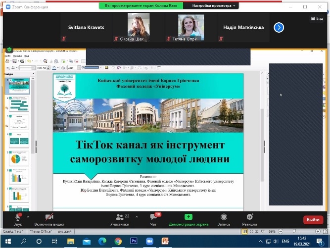 19 березня 2021 року студенти Фахового коледжу «Універсум» Київського університету імені Бориса Грінченка Кулик Юлія, Коляда Катерина третього курсу та Юр Богдан четвертого курсу спеціальності «Менеджмент» взяли участь у Всеукраїнській науково-практичній конференції «Дослідження молодих вчених від ідеї до реалізації». Вони презентували проєкт «ТікТок канал як інструмент саморозвитку молодої людини».