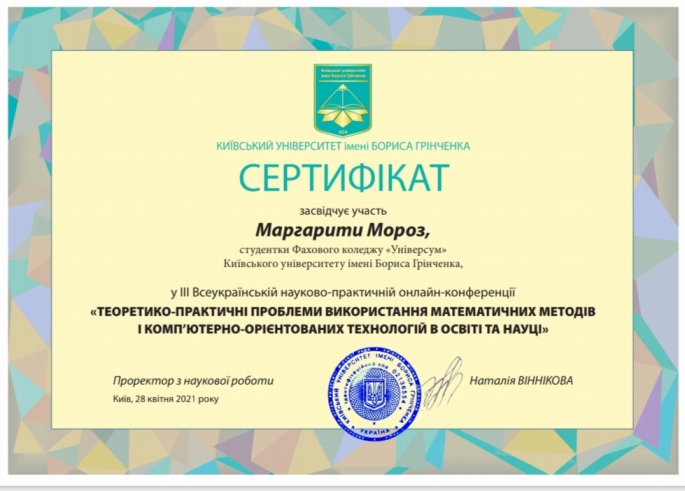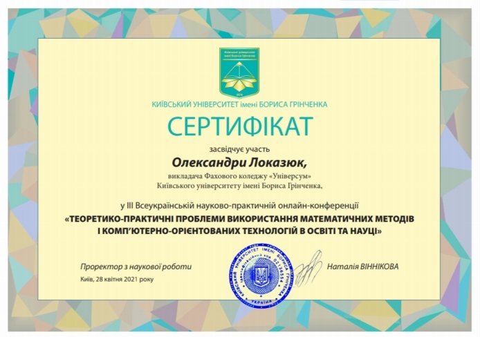 28 квітня 2021 року на базі Київського університету імені Бориса Грінченка відбулася ІІІ Всеукраїнська науково-практична конференція «Теоретико-практичні проблеми використання математичних методів і комп’ютерно-орієнтованих технологій в освіті та науці».