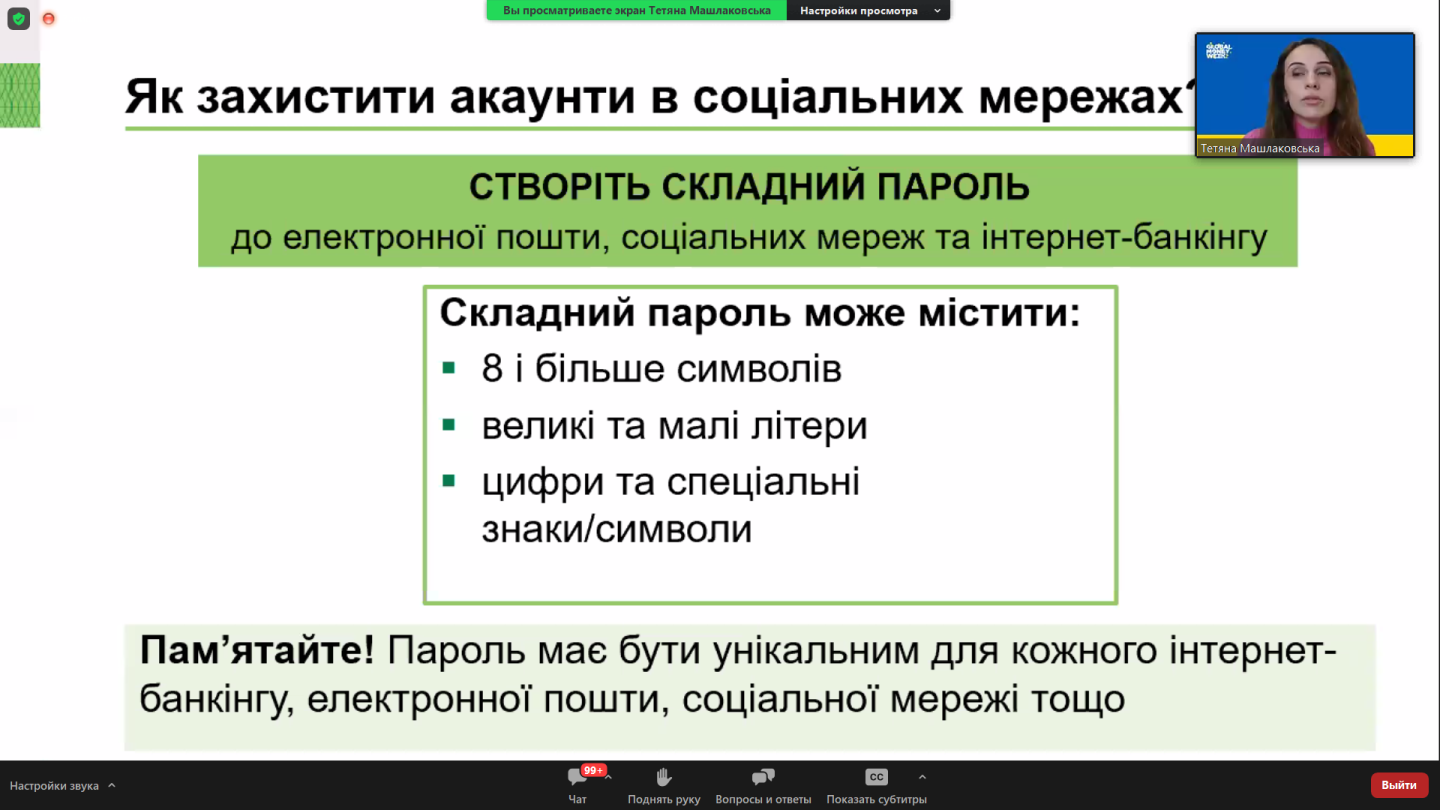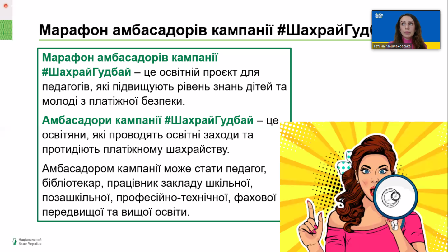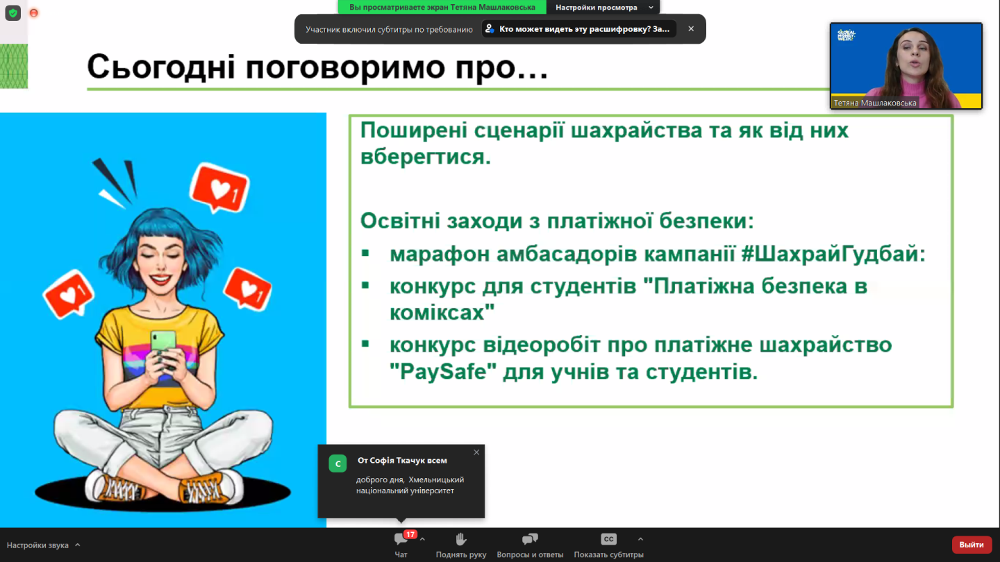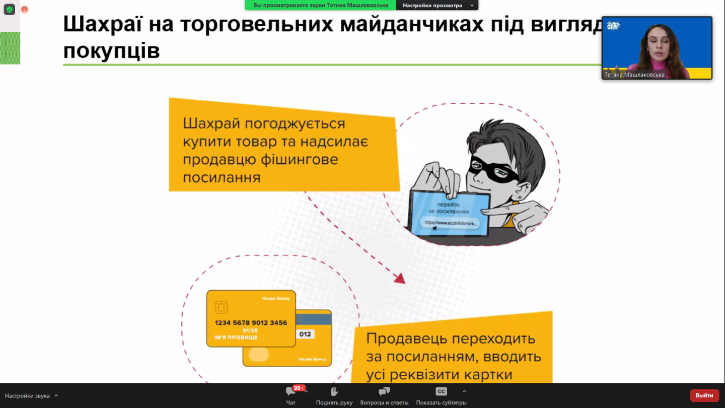 24 березня студенти та викладачі ЦК економіко-математичних дисциплін і менеджменту взяли участь у вебінарі «10 найпоширеніших схем платіжного шахрайства у воєнний час» за авторством головної експертки управління зв’язків з громадськістю та фінансової обізнаності Національного банку України Тетяни Машлаковської.