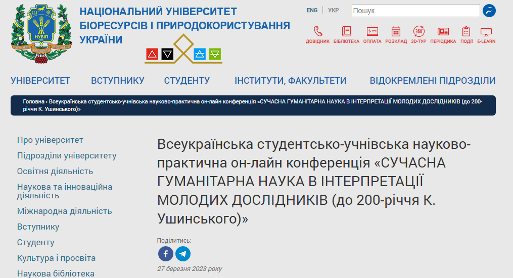27 квітня 2023 року члени гуртка "Градієнт" взяли участь у Всеукраїнській студентсько-учнівській науково-практичній он-лайн конференції "Сучасна гуманітарна наука в інтерпретації молодих дослідників (до 200-річчя К. Ушинського)".