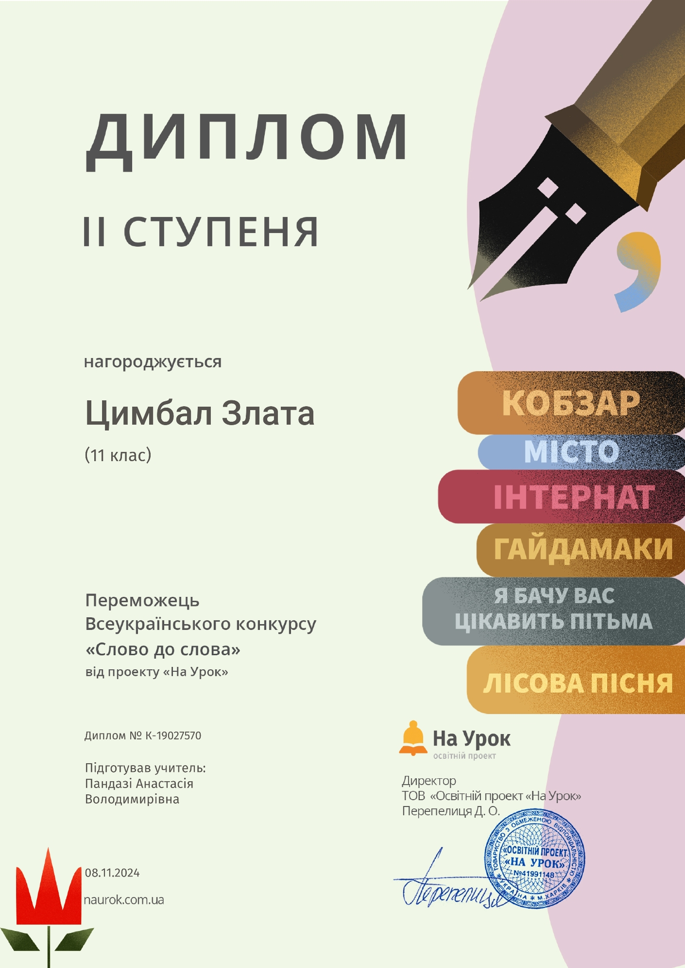 Студенти групи ОВфмб-1-23-3,5д під керівництвом куратора Пандазі А.В. долучилися до Всеукраїнського інтернет-конкурсу «Слово до слова» на платформі «На урок», присвяченого Дню української писемності та мови, який проходив з 15 жовтня по 12 листопада 2024 року..