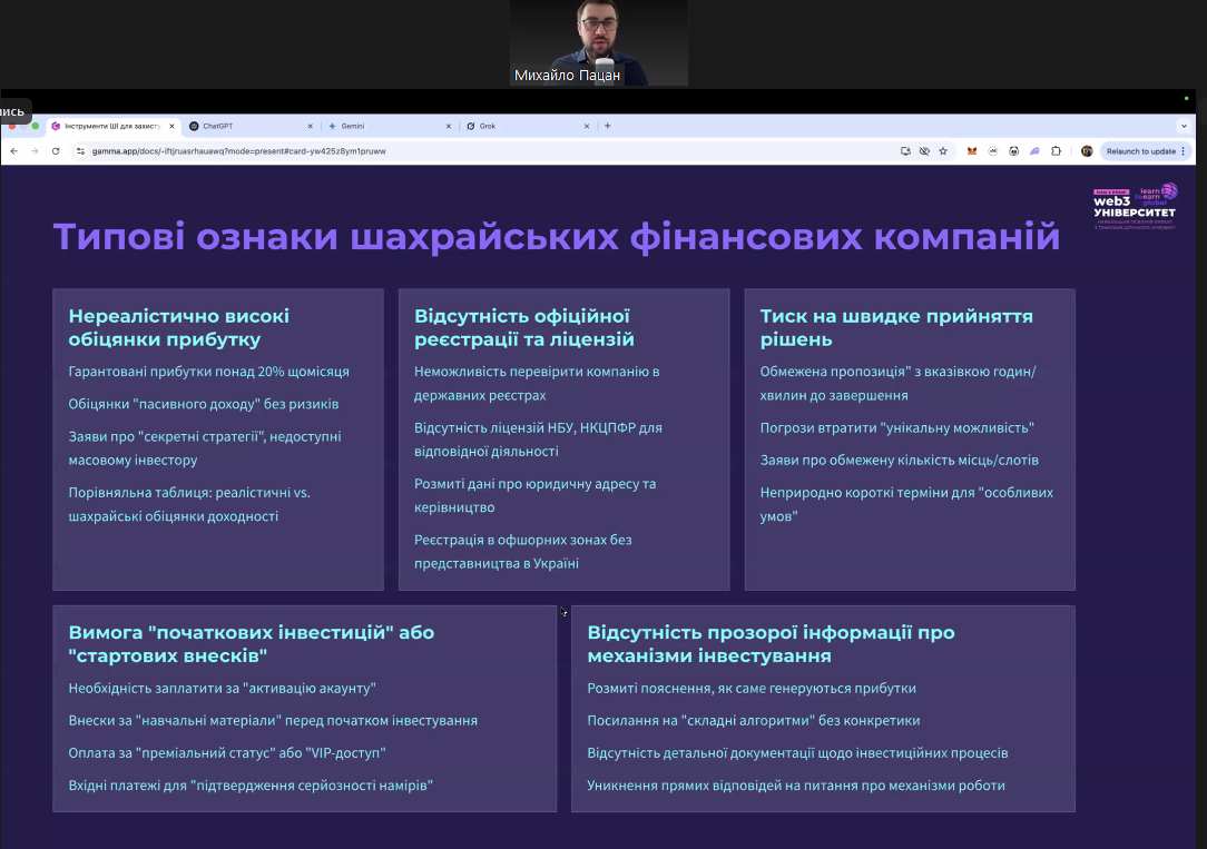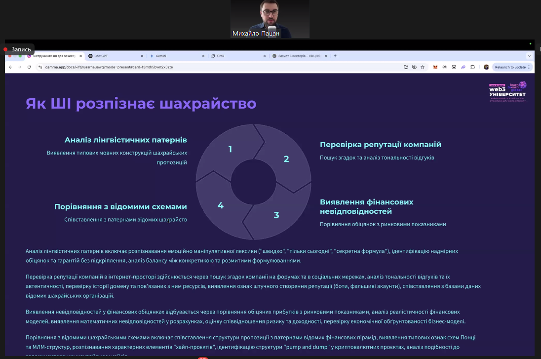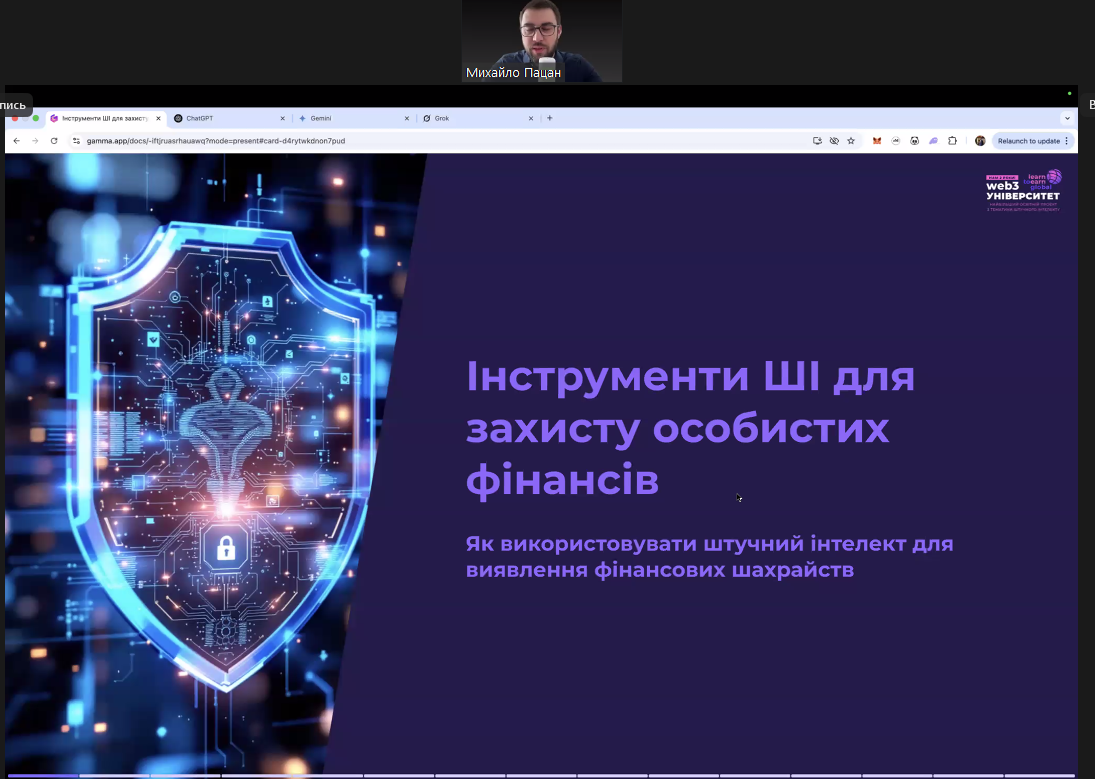 17 березня 2025 р. в рамках декади циклової комісії економіко-математичних дисциплін і менеджменту відбувся вебінар на тему «Інструменти ШІ для захисту особистих фінансів» від Національного банку України, в якому взяли участь студенти 2-3 курсу ОПП Фінанси та кредит і 4 курсу ОПП Організація виробництва. Захід проводив Михайло Пацан, підприємець, інвестор, керуючий активами, експерт з міжнародних фінансових ринків та WEB3 технологій. Доповідач ознайомив з особливостями використання штучного інтелекту для виявлення фінансових шахрайств, а також дав практичні поради щодо роботи ШІ.